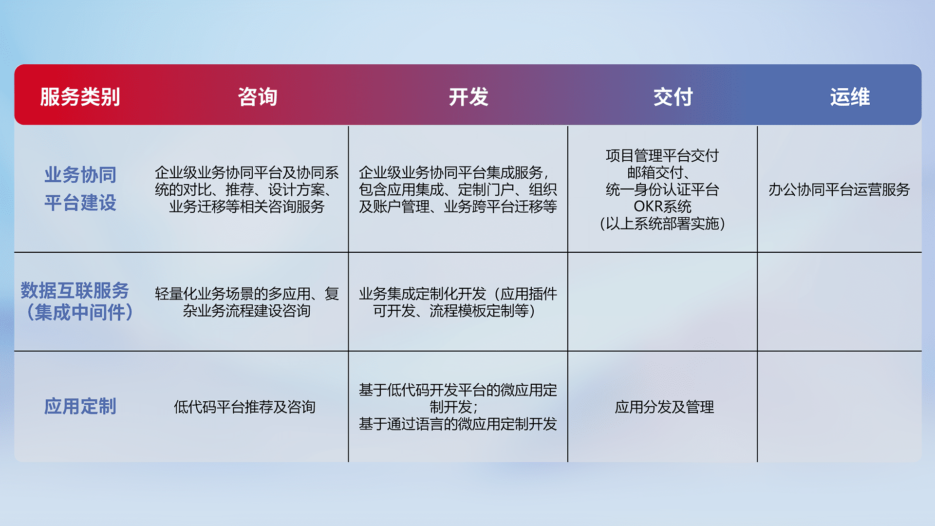 针对钉钉、、、企微、、、IDaas等平台级产品提供产品的规划、、、、方案、、、交付、、、定制化开发等服务,,,,实现如统一协同办公、、、、智能客户服务、、、、混合会议管理、、智能数据查询、、、、等业务场景,,实现数字化转型。。。